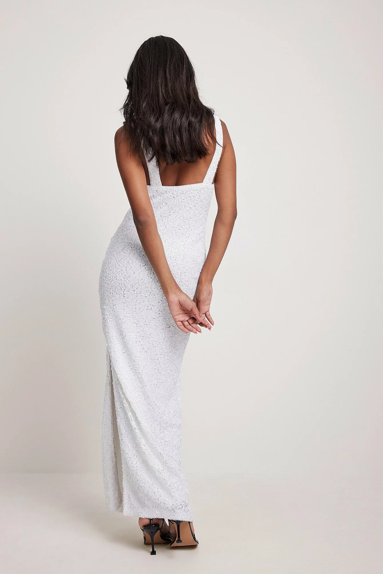 This maxi dress is sleeveless and made of sequin and features a scoop neck. Side slit= extra room for dancing.